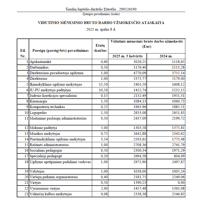 2025 m. III ketv. lopšelio-darželio „Ežerėlis“ darbuotojų nustatytas vidutinis mėnesinis darbo užmokestis eurais, neatskaičius mokesčių