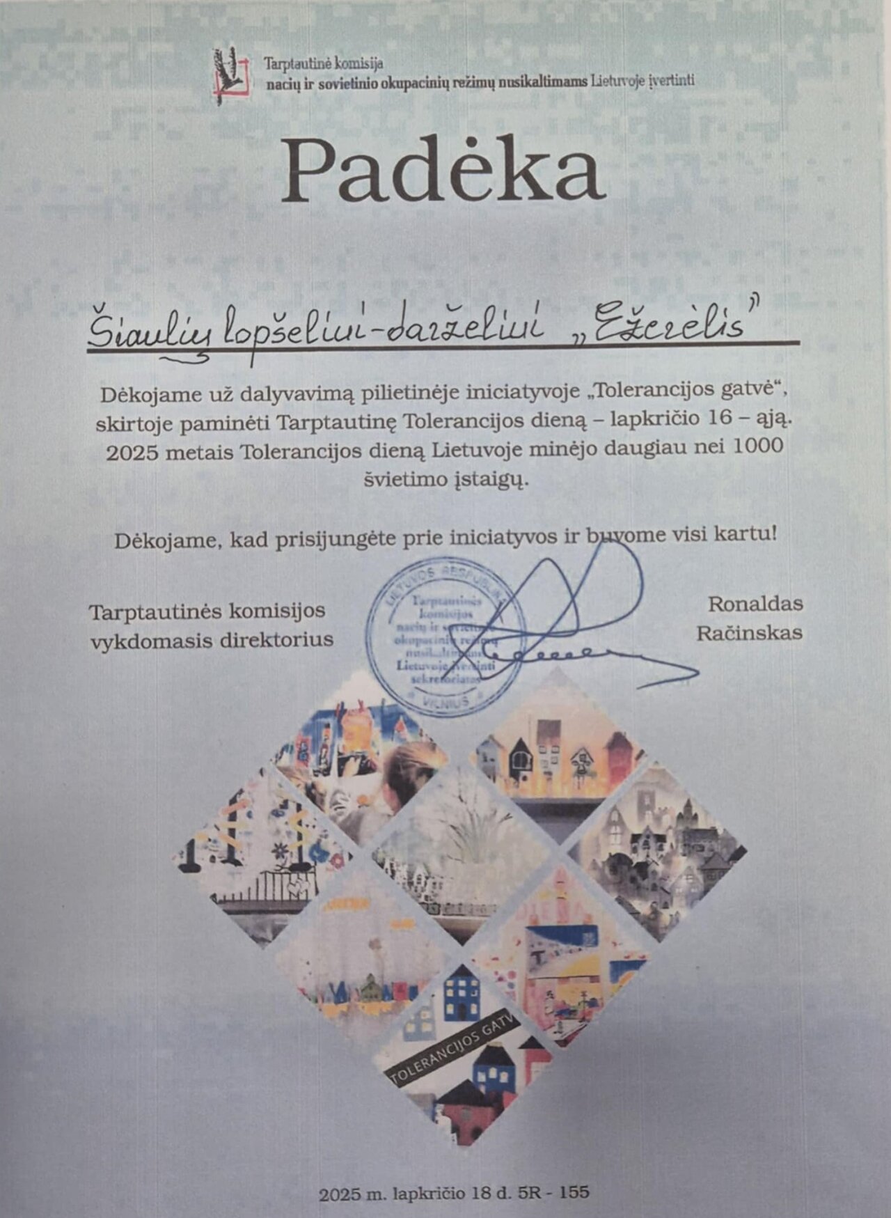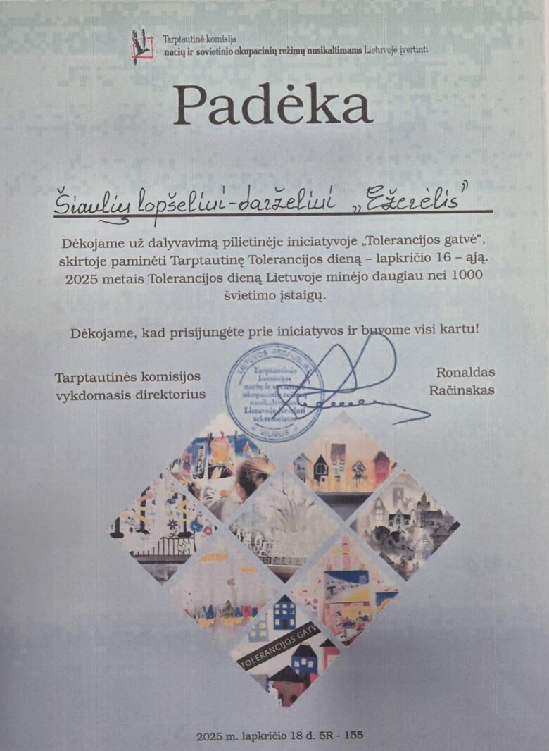 Padėka Šiaulių lopšeliui-darželiui "Ežerėlis"