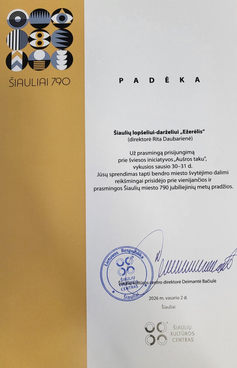 Padėka Šiaulių lopšeliui-darželiui "Ežerėlis"