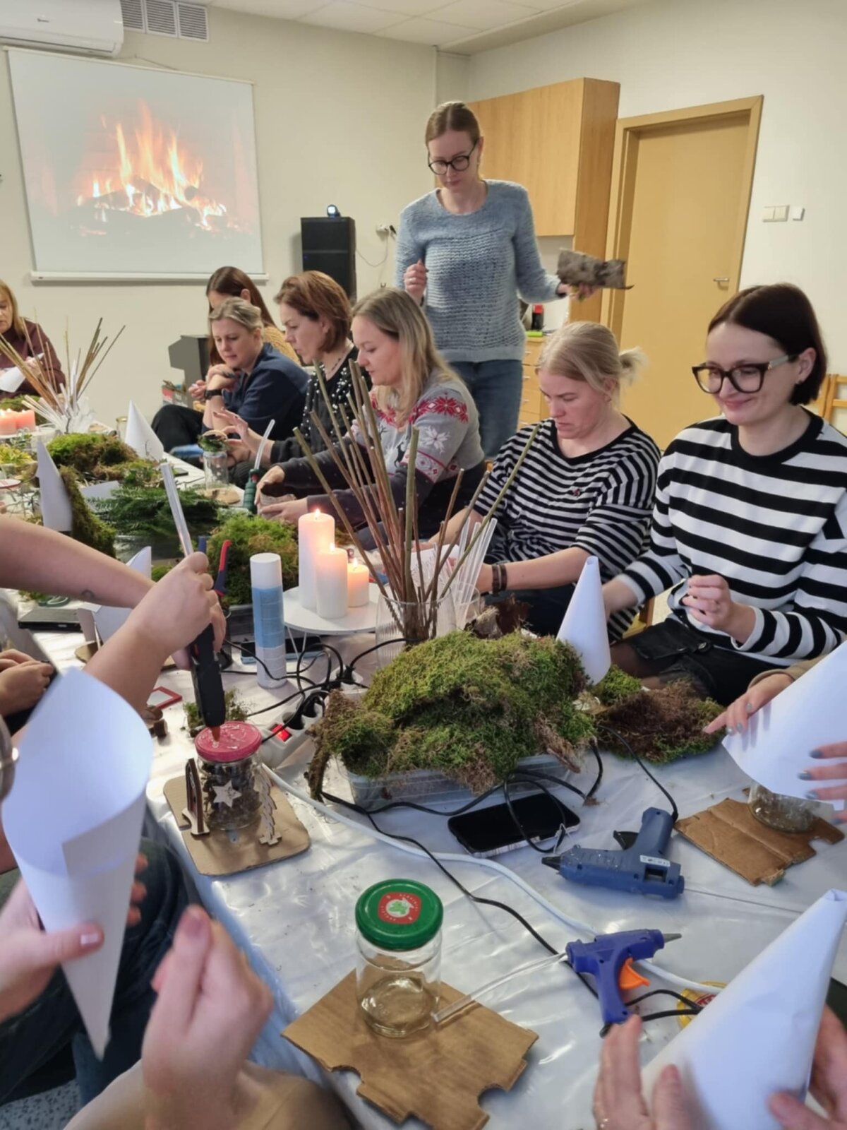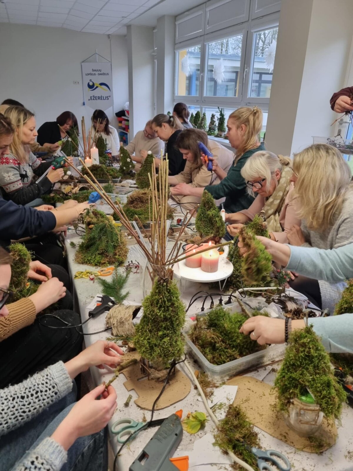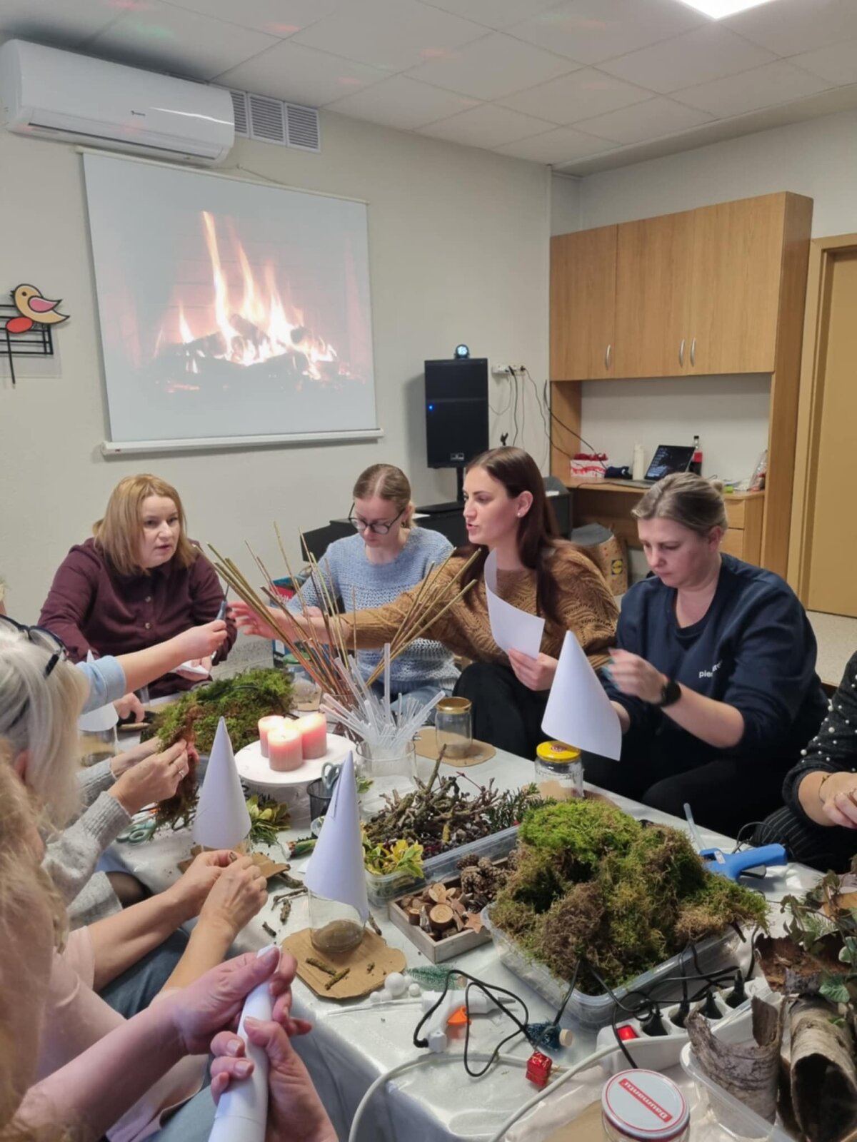 2025 m. gruodžio 10 d. mūsų lopšelio-darželio darbuotojai susirinko į šiltas ir įkvepiančias kūrybines dirbtuves „Magiškas miškas“, kurias inicijavo mūsų kūrybiškos mokytojos Indrė ir Monika. Čia, lydimi jaukių pokalbių, gerų emocijų ir bendrystės jausmo, visi kartu kūrėme paslaptingą, stebuklais dvelkiantį mišką. Iš samanų, šakelių, natūralių miško gėrybių gimė žaismingos giraitės, mažieji nameliai ir fantaziją žadinančios miško istorijos. Kūrybinių dirbtuvių rezultatai virto nuotaikinga bendruomenės paroda „Magiškas miškas“, kuri eksponuojama darželio koridoriaus erdvėje.