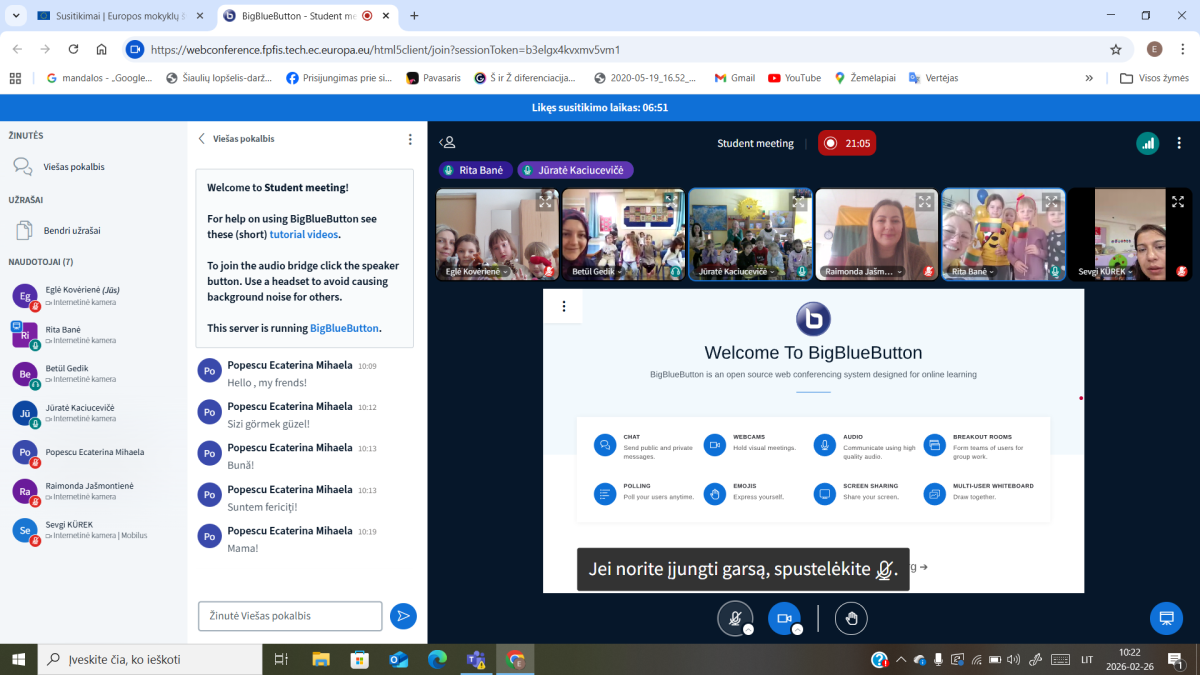 2026 m. vasario 26 d. įvyko visų projekte dalyvaujančių šalių (Turkijos, Rumunijos, Bulgarijos, Lietuvos) dalyvių nuotolinis susitikimas, sujungęs šių šalių ugdymo įstaigų vaikus ir mokytojus bendram kūrybiniam dialogui. Susitikimo metu vaikai susipažino su kitų šalių bendraamžiais, pristatė savo šalį bei atskleidė gimtosios kalbos grožį kalbėdami, dainuodami, deklamuodami eilėraščius savo gimtąja kalba. Skirtingos kalbos suskambo vienoje virtualioje erdvėje, parodydamos, kad muzika ir bendravimas neturi sienų.