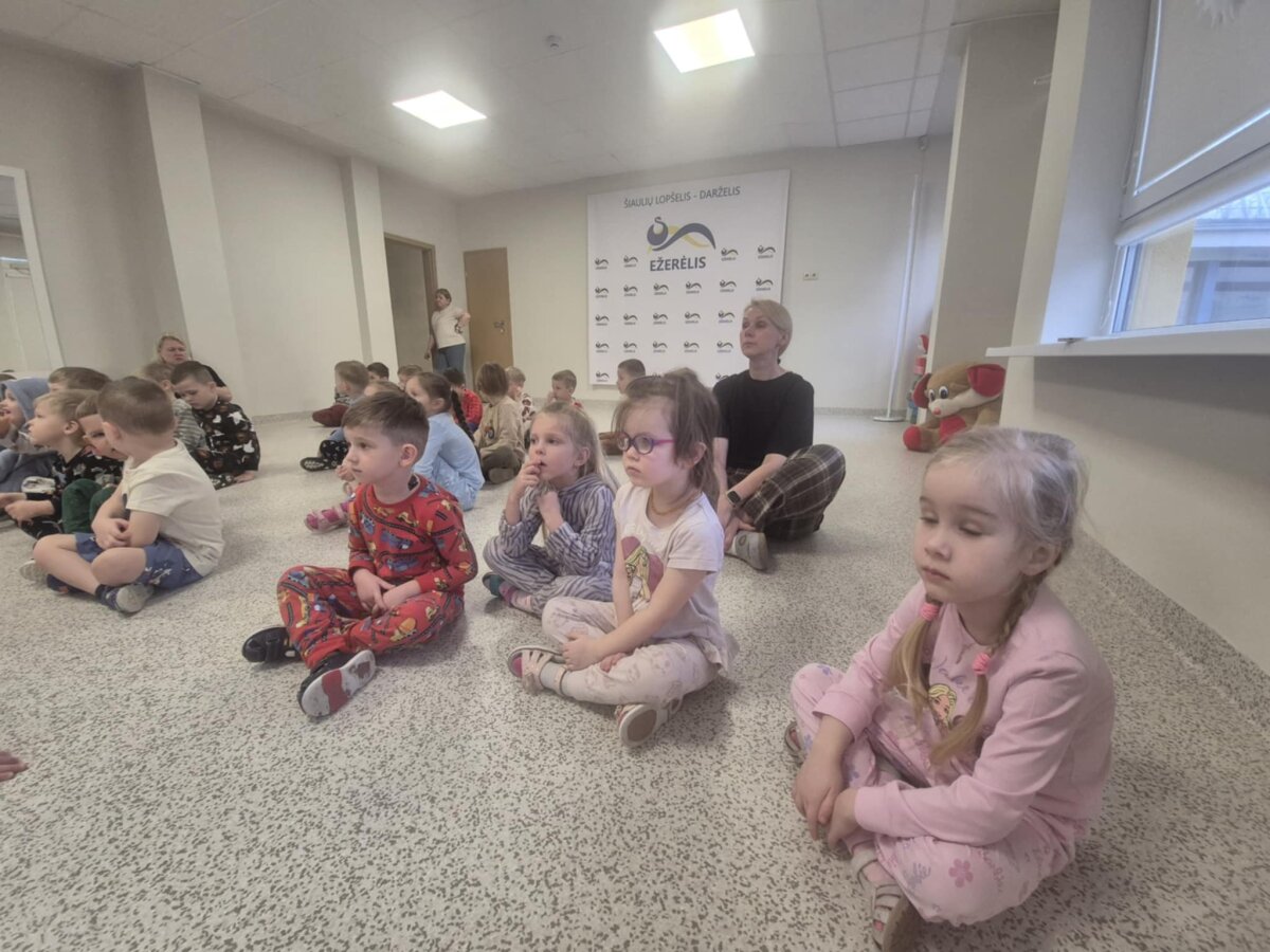 Mokytoja Rūta Gedvilienė pakvietė vaikus pajudėti, atlikti įvairius tempimo ir aktyvius pratimus, kurie padėjo prabusti ir pasikrauti geros nuotaikos visai dienai. Po aktyvios mankštos vaikai mokėsi ir atsipalaiduoti – visuomenės sveikatos priežiūros specialistė Lolita Jurgutavičienė vedė ramius atsipalaidavimo pratimus, kurie padėjo nuraminti kūną ir kvėpavimą.